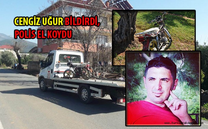 Olay, saat 12.00 sıralarında Aydın Mahallesi Atatürk caddesinde meydana geldi. Cengiz Uğur avokado bahçesini kontrol ederken, zeytin ağacının dibinde atılı halde bir motosiklet olduğunu fark etti. Merak edip motosiklete baktığında, yakıt deposunun, plakasının ve kontak anahtarının olmadığını fark etti. Duyarlı vatandaş Cengiz Uğur motosikletin çalıntı olabileceğini düşünüp polis 155’i arayarak durumu bildirdi. Olay yerine gelen polis, motosiklette inceleme yaptı. Şase ve motor numaralarında yapılan İnceleme sonrasında, motosikletin trafikten çekme belgeli olduğu ve trafiğe çıkışının yasak olduğu belirlendi. Motosikletin nasıl oraya geldiği ve kim tarafından bırakıldığı tespit edilemezken, motosiklet bulunduğu yerden çekici yardımıyla bulunduğu yerden alınarak yedi emin deposunu kaldırıldı.