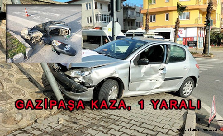 Olay, saat 16.00 sıralarında D-400 Karayolu jandarma kavşağında meydana geldi. Ç.Ç. idaresindeki 07 UD 358 plakalı motosiklet kavşak içerisinden Bülent Ecevit Caddesi'ne çıkmak istediği esnada, Anamur istikametinden Alanya istikametine doğru seyir halinde olan E.Ç. yönetimindeki 48 M 5426 plakalı otomobille çarpıştı. Yaklaşık 15 metre sürüklenen motosikletten düşen sürücü yaralandı. Çevredeki vatandaşların ihbarı üzerine olay yerine sağlık ve polis ekipleri sevk edildi. Olay yerinde ilk müdahalesi yapılan yaralı, Gazipaşa Devlet Hastanesi'ne götürülüp, tedaviye alındı. Kazaya karışan otomobilin afet bölgesine yardım götürdükten sonra dönüş yolunda olduğu öğrenildi. Polis olayla ilgili inceleme başlattı.